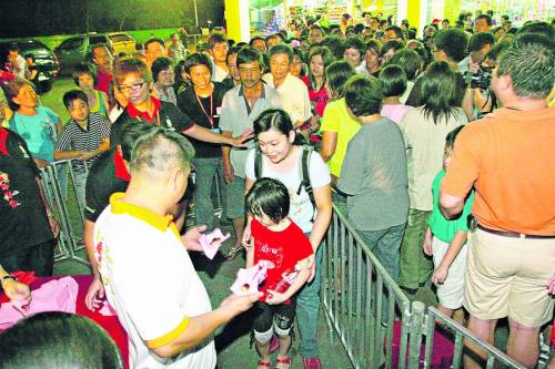 當(dāng)晚,檳州首長林冠英偕夫人及孩子在7時35分抵步,在大山腳民眾陪同下,切下全馬最大月餅“月光寶盒”,原來月餅內(nèi)藏有一個寶盒寫著“恭賀各界中秋節(jié)快樂”。