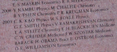 此次新刻上的11個名字是2009年諾貝爾獎的得主,其中包括高錕和George E. Smith等三位物理獎得主、Thomas A. Steitz等兩位化學(xué)獎得主、Jack W. Szostak等三位醫(yī)藥類獎得主、Oliver E. Williamson等兩位經(jīng)濟(jì)獎得主和獲得和平獎的美國總統(tǒng)奧巴馬的名字。
