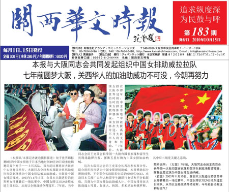 這次大阪同志會的王克菲會長再次和日本《關(guān)西華文時報》合作,聯(lián)合組織拉拉隊為中國女排現(xiàn)場助威。