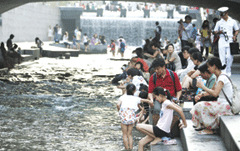 王某一家人從免稅店出來走向清溪川。清溪川是在中國也很有名的旅游景點。雖然是晚間時分,但天氣依然炎熱。王某的兩個兒子跳入水中。稍后而來的其他游客也脫掉鞋子進入水中。一位游客說:“很涼快,很舒服。孩子們也很喜歡。在城市中心建設(shè)小溪,感到很羨慕。”