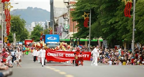 在醒目的“中華社區(qū)”英文橫幅后面,是幅面巨大的五星紅旗和新西蘭國旗。兩面旗幟都是3米寬5米長,合計面積達(dá)到30平方米,需要12個人共同擎舉,極為引人注目。華人隊(duì)伍聲勢浩大,鑼鼓喧天,紅旗招展,觀眾們看到隊(duì)伍過來,遠(yuǎn)遠(yuǎn)就開始熱情鼓掌歡迎,主持人還組織觀眾學(xué)著用中文齊聲高喊:“你好!”形成一股巨大的聲浪,向中華社區(qū)方陣致意,向基督城華人問好。
