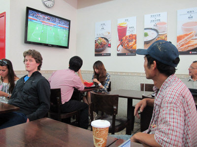 不少球迷早已準備好享受這場足球盛宴,據(jù)美國《星島日報》報道,紐約下東城不少酒吧、餐廳甚至小區(qū)團體早已準備了看球場地,以吸引顧客。華埠地威臣街“香港站”快餐店門外的大餐牌早早的就換成世界杯賽事的中英文海報和賽程細表,店內(nèi)兩部寬屏的液晶電視,輪流播著不同體育節(jié)目。