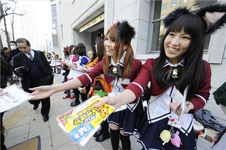 據(jù)報(bào)道,“女仆們”聚集在以“御宅街”聞名的大阪日本橋上,這樣做的目的是要鼓勵(lì)因經(jīng)濟(jì)不景氣而易陷入消沉的上班族。來來往往的行人看到這番不同于往常的景象都感到吃驚,但也有人面露羞澀的微笑或是拿出照相機(jī)留念。