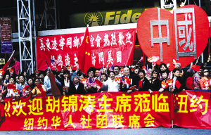 9月21日,中國國家主席胡錦濤抵達紐約出席聯(lián)合國峰會,美國東部地區(qū)3000華人華僑聚集在紐約曼哈頓華爾道夫酒店附近,熱烈歡迎。歡迎人群來自紐約、新州、賓州、康州等地,大紐約地區(qū)各大高校也組織了上千留學生前往歡迎,F(xiàn)場有鮮艷的國旗及醒目多樣的歡迎標語,歌聲雷動、歡呼聲不斷!稅畚抑腥A》、《大中國》、《歌唱祖國》等歌曲回蕩在曼哈頓上空。不少歡迎者更是興奮地跳起了舞,歡迎遠方的貴客。歡迎人群中年齡最小只有10個月大,最大的已經(jīng)80多歲。中國駐美大使周文重代表胡錦濤向歡迎隊伍,以及美國的所有華人表示感謝。