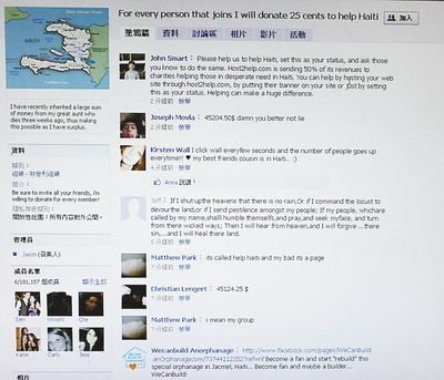 事實上,王Jason并不是唯一發(fā)起該行動的人或組織,在Facebook網(wǎng)站,在搜索欄輸入英文Haiti,就會顯示2800個相關搜索結果,有的群組主旨和王Jason發(fā)起的類似,比如“該群組每加入一個人我就捐0.05美分幫助海地”、“該群組每加入一個人我就捐10美元幫助海地”,區(qū)別只是捐助金額的不同,但目前加入王Jason創(chuàng)立的群組人數(shù)最多。