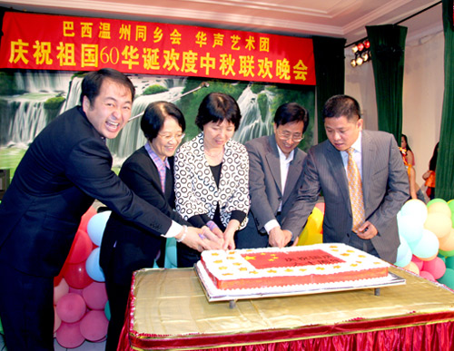 中新網(wǎng)9月21日電 據(jù)巴西南美僑報(bào)/巴西僑網(wǎng)報(bào)道,巴西溫州同鄉(xiāng)會(huì)與華聲藝術(shù)團(tuán)慶祝祖國60華誕歡度中秋節(jié)聯(lián)歡晚會(huì)19日晚在溫州同鄉(xiāng)會(huì)會(huì)館舉行,中國駐圣保羅總領(lǐng)事孫榮茂夫婦以與數(shù)百僑胞歡聚一堂,度過一個(gè)熱烈歡欣的夜晚。