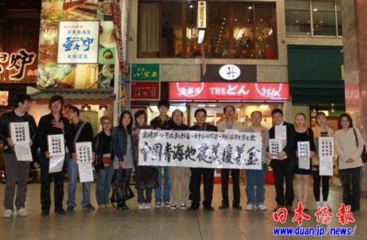 災(zāi)情就是命令!災(zāi)難無(wú)情,人間有愛(ài)!4月22日(星期四),愛(ài)媛松山一大早下起了多年未見(jiàn)的瓢潑大雨,但愛(ài)媛縣的同胞和日本友人仍然按照約定的時(shí)間,冒著大雨毅然走上街頭,開(kāi)始了由聯(lián)合會(huì)帶頭部署倡導(dǎo)的聲勢(shì)浩大的街頭募捐活動(dòng)。由三十多人組成的募捐隊(duì)伍,彼此不分中國(guó)人還是日本人,用真心與熱情共同譜寫(xiě)、詮釋人間大愛(ài)——心向玉樹(shù),情系災(zāi)區(qū)!四幅由聯(lián)合會(huì)副會(huì)長(zhǎng)、旅日山水畫(huà)家牛子華即時(shí)揮毫寫(xiě)就的《愛(ài)媛縣華僑華人聯(lián)合會(huì) 中國(guó)留學(xué)生學(xué)友會(huì) 日中友好協(xié)會(huì):為中國(guó)青海地震義援募金》的巨大橫幅在指定地點(diǎn)拉開(kāi)了,募捐隊(duì)伍懷抱著十多個(gè)由聯(lián)合會(huì)事務(wù)局準(zhǔn)備的專(zhuān)用募捐箱,拉開(kāi)了活動(dòng)的序幕!鞍萃袨橹袊(guó)青海地震災(zāi)區(qū)獻(xiàn)愛(ài)心”的募捐聲,聲聲入耳。向來(lái)對(duì)救災(zāi)特別熱情的日本國(guó)民開(kāi)始駐足慷慨解囊……和兩年前祖國(guó)汶川大地震賑災(zāi)募捐情景同樣感人的一幕再次在同一地點(diǎn)重新演繹。我們禁不住熱淚盈眶——祈福災(zāi)區(qū)人民!衷心感謝熱情、善良、友好的人們!第一天共募集到58,700日元。