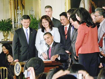 中新網(wǎng)10月16日電 據(jù)美國《世界日報》報道,美國百余位亞太裔14日齊聚白宮,參加恢復白宮總統(tǒng)亞太裔顧問委員會及白宮亞太裔計劃的儀式。奧巴馬總統(tǒng)在白宮東廳,宣布華裔聯(lián)邦商務部長駱家輝(Gary Locke),及教育部長唐侃(Arne Duncan),將出任該顧問委員會共同主席,委員會隸屬于教育部之下。