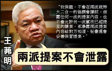 中新網(wǎng)9月9日電 據(jù)馬來西亞《星洲日?qǐng)?bào)》報(bào)道,馬華總秘書王茀明8日說,他保證不會(huì)在兩派就特大二合一的協(xié)調(diào)會(huì)議前,泄露任何一派的提案內(nèi)容,甚至允許另一派竄改已經(jīng)提呈的議案,或暴露兩派提案內(nèi)容給對(duì)方知道。