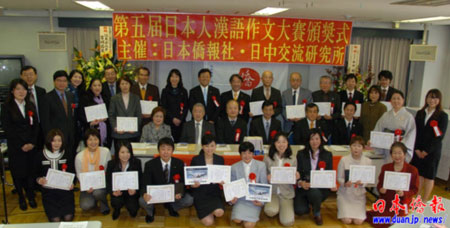 “第五屆日本人漢語作文大賽”共有36名應(yīng)征者獲獎(jiǎng),中國駐日使館許澤友總領(lǐng)事代表程永華大使為川松若菜(學(xué)生組)和佐藤美緒子(社會(huì)組)頒發(fā)了“中國大使獎(jiǎng)”。