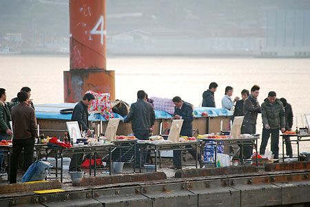 2月2日上午,中國船員家屬來到長崎漁港,登上?吭谀抢锏牡谝簧教锿瑁来螖[放好6名中國船員的彩色遺照。按照中國舟山的習(xí)俗,每幅遺照前面點燃起兩根蠟燭和3個焚香,擺放好兩束鮮花和從國內(nèi)帶來的紹興花雕酒以及親人日常喜歡吃的水果、糕點……當(dāng)他們最后把一杯一杯的紹興花雕酒灑向大海的時候,當(dāng)他們悲痛的哭喊聲在甲板上空回蕩的時候,所有在場的人都潸然淚下。