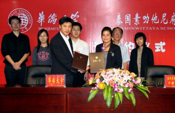 中新網(wǎng)10月27日電 據(jù)華僑大學(xué)新聞網(wǎng)消息,10月24 日上午,華僑大學(xué)與泰國(guó)素叻他尼府華萌學(xué)校在華大廈門校區(qū)簽署合作備忘錄。華僑大學(xué)華文教育辦公室主任趙明光、泰國(guó)素叻他尼府華萌學(xué)校副經(jīng)理安蒙麗分別代表雙方在合作備忘錄上簽字。出席簽字儀式的還有泰國(guó)素叻他尼府華萌學(xué)校校董涂碧泉及華僑大學(xué)華文教育辦公室工作人員。