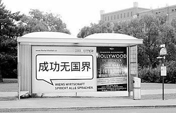 近日,奧地利維也納街頭出現(xiàn)了一些漢字廣告。隨著中國(guó)國(guó)際影響的增加,奧地利人對(duì)中國(guó)的關(guān)注度和對(duì)中國(guó)文化的興趣也在不斷上升。維也納大學(xué)漢學(xué)系的學(xué)生從中國(guó)改革開(kāi)放前的約50人激增到現(xiàn)在的約700人;奧地利的漢語(yǔ)教學(xué)機(jī)構(gòu)從維也納大學(xué)漢學(xué)系1家增加到現(xiàn)在的約70家;通過(guò)各種方式學(xué)習(xí)漢語(yǔ)的有數(shù)千人。當(dāng)?shù)亟逃块T(mén)已在考慮將漢語(yǔ)列入中學(xué)的教學(xué)大綱。正是在這一背景下,漢字廣告牌出現(xiàn)在維也納街頭。圖為10月8日維也納南火車站旁一個(gè)公共車站的廣告牌,上面張貼著維也納商會(huì)的廣告“成功無(wú)國(guó)界”。(方祥生 攝)