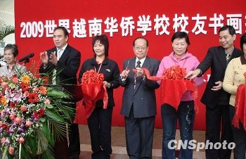 11月17日,2009世界越南僑校校友書畫攝影藝術展在廣西南寧開展。參展的近50幅作品由來自世界各地的越南僑校校友畫家、書法家創(chuàng)作,包括加拿大溫哥華藝術家韋長華、加拿大著名攝影家焦根基等。藝術展分為油畫、水墨、水彩、書法等種類,內容涉及山水花鳥、人物、歷史、古詩詞等。圖為廣西壯族自治區(qū)僑聯(lián)副主席劉漢祥、加拿大越北華人聯(lián)合總會主席謝卓裕等嘉賓為藝術展剪彩。 中新社發(fā) 黃艷梅 攝