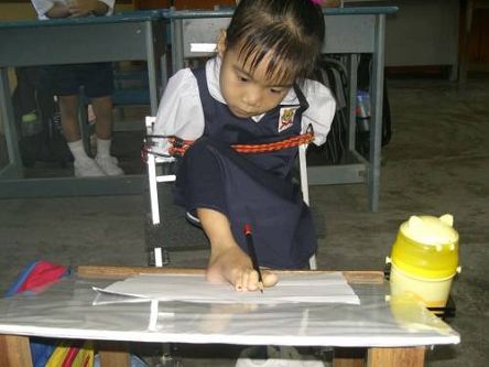 她五六歲在附設于吉北循正華小的學前幼兒園開始上學,家人就用特制的畫板式桌子,及舅舅為她度身制作如小童學步車設計、用雙腳操縱的小輪椅,每天攜帶這套特別桌椅到學校讓她和其他小孩一起上課。