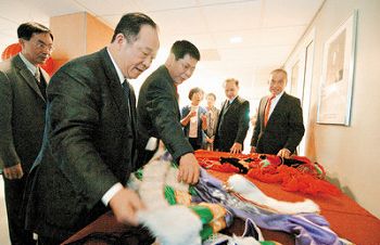圖為廣東僑辦主任吳銳成(左二)拜會中華文化中心,捐贈多件蒙古族傳統(tǒng)服裝。((關(guān)文杰 攝)