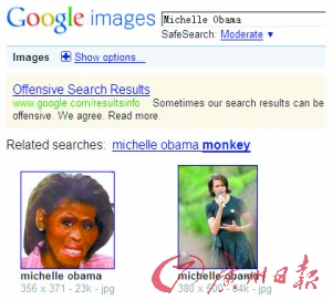 當用戶通過谷歌搜索引擎搜索奧巴馬夫人的照片時,一張帶有嚴重歧視性的照片出現(xiàn)在搜索結果的最前列。這張照片將米歇爾面部“惡搞”成猴子形象。這對于黑色人種的米歇爾而言,無疑是最嚴重的侮辱方式。