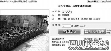 近日,店主“千尋kission”在淘寶網(wǎng)上發(fā)布了“磚頭大甩賣(mài),玩死快遞公司專(zhuān)用”的銷(xiāo)售標(biāo)題,表示將以5元一斤的價(jià)格販賣(mài)磚頭。其中的產(chǎn)品說(shuō)明還頗有幾分《武林外傳》中呂秀才的風(fēng)采:“泄憤也可用磚頭,本磚頭專(zhuān)為對(duì)付那些服務(wù)態(tài)度不好的快遞送貨員設(shè)計(jì),如果你們對(duì)那些惹您生氣的快遞員投訴無(wú)門(mén),無(wú)處泄憤請(qǐng)拍下此產(chǎn)品!