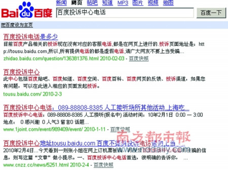 事態(tài)記者楊濤 報道 昨日,本報報道了山寨“百度投訴電話”被百度搜索置頂?shù)碾x奇事件,昨日,記者追訪此事時發(fā)現(xiàn),電話區(qū)號為“0898”的山寨“百度投訴中心”已經(jīng)不再置頂,但昨日晚間搜索時,該網(wǎng)站仍然位列搜索結(jié)果的第三位。只是隨后的一條搜索結(jié)果提醒用戶,“百度不提供投訴電話,請勿上當(dāng)”。被騙的張小姐得知此消息后亦哭笑不得。她表示對此事報警的目的不在于索賠,但網(wǎng)絡(luò)的管理實在有待加強。