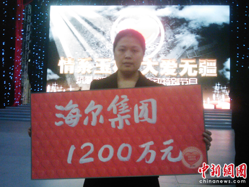 中新網(wǎng)4月21日電 4月20日,由中宣部、國家廣電總局、民政部、中國紅十字會(huì)主辦,中央電視臺(tái)承辦的《情系玉樹 大愛無疆--抗震救災(zāi)大型募捐活動(dòng)特別節(jié)目》在中央電視臺(tái)現(xiàn)場直播。海爾集團(tuán)在現(xiàn)場向?yàn)?zāi)區(qū)捐款1200萬元,全力支持災(zāi)區(qū)緊急救災(zāi)和災(zāi)后重建工作。