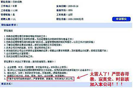 8月31日,網(wǎng)友“湘水悠悠”在爆料說,他在求職網(wǎng)上看到一個超級雷人公司招聘啟事,職位要求里面竟然有莫名其妙的規(guī)定:不屬于任何網(wǎng)絡(luò)教派,嚴(yán)禁春哥教、寂寞黨、時彩族加入本公司。