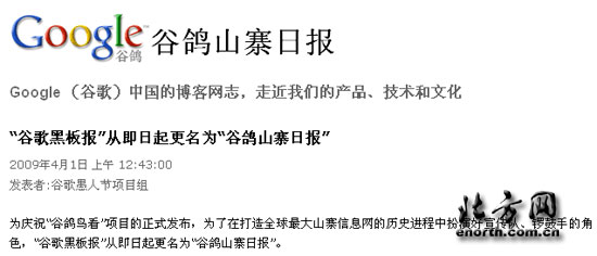 同時(shí),為慶祝“谷鴿鳥看”項(xiàng)目的正式發(fā)布,谷歌中國的官方博客“谷歌黑板報(bào)”也在今日“撰文宣布“改名”為“谷鴿山寨日報(bào)”。該博客稱:“為了在打造全球最大山寨信息網(wǎng)的歷史進(jìn)程中扮演好宣傳隊(duì)、鑼鼓手的角色,‘谷歌黑板報(bào)’從即日起更名為‘谷鴿山寨日報(bào)’”。但記者注意到,該日志的發(fā)布者署名為“谷歌愚人節(jié)項(xiàng)目組”,想必“谷鴿鳥看”和“谷鴿山寨日報(bào)”的改名行動(dòng)都是今天這個(gè)特殊節(jié)日的一部分。