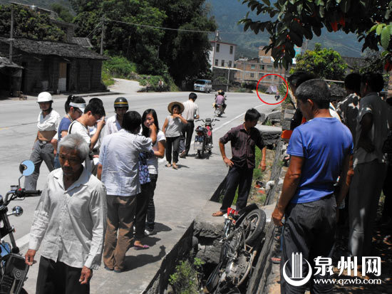 記者昨日上午10時趕到位于永春達埔鎮(zhèn)東園村委會附近的事發(fā)現場時,警方仍在現場勘察。據了解,死者張某泉今年38歲,家住在距東園村五六公里遠的錢峰村!叭颂稍谶@個地方,摩托車卻翻倒在100多米外的水溝里!睆埬橙囊晃挥H戚指著路對面的涼棚告訴記者,張某泉的遺體就停放在那里。
