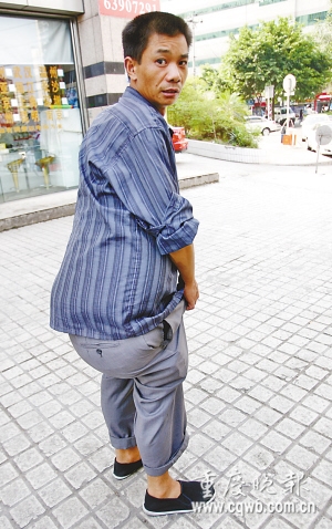 來自四川鄰水的郭遷安身高僅1.6米,體重卻有85公斤,其中,有40公斤是腫瘤。昨天,記者看到,郭遷安腰間的大腫瘤墜到臀部以下,活像衣服里藏了包東西。