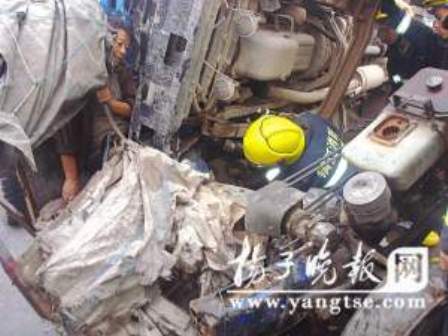 昨天清晨6時(shí)左右,在鎮(zhèn)江金橋大道卡口處,一滿(mǎn)載石料的貨車(chē)與一拖拉機(jī)發(fā)生相撞,蘇LC3×17的貨車(chē)車(chē)頭側(cè)翻后死死壓在拖拉機(jī)上,將拖拉機(jī)的簡(jiǎn)易駕駛室徹底壓趴后壓斷方向盤(pán),導(dǎo)致拖拉機(jī)司機(jī)被困其間,雙腿被牢牢壓住。幸運(yùn)的是,司機(jī)的上半身沒(méi)有受傷,并且在兩車(chē)交接處有空隙,他還能時(shí)不時(shí)伸出頭來(lái)呼吸一點(diǎn)新鮮空氣。