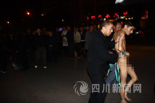昨日凌晨40分左右,涪城區(qū)御營壩鄧氏火鍋門口圍著一大堆人,一名20來歲的小伙正將一輛白色汽車攔在馬路中間,神色緊張,情緒激動,并手舞足蹈地口說著什么,特別令人費解的是,該男子身上居然沒有一件衣物——完全裸露。其中一名圍觀的市民說,他和同伴路過此地時,看見這名青年男子正瘋狂地攔截車輛,好像很焦急的樣子。為了不影響交通以及該男子的人身安全,他便撥打了110。