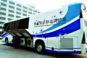 食品安全移動實(shí)驗(yàn)室,到底是個什么樣子?單從外觀來看,這就是一輛普普通通的12米長的大客車,只是客車外噴上了藍(lán)色的“食品安全移動實(shí)驗(yàn)室”的字樣。車廂里可是“麻雀雖小,五臟俱全”,擺放了各種精密儀器、試管、量杯……