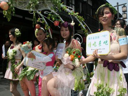 當(dāng)天正值第四十個(gè)世界地球日,成都文殊坊街上人流熙攘。這幫身披菜葉的年輕漂亮女子馬上就成為行人注目的焦點(diǎn),“喲,遠(yuǎn)看就只掛了些菜葉子在身上,原來還是穿了點(diǎn)紗的嘛,是不是又在搞什么商業(yè)活動(dòng)哦?”四川新聞網(wǎng)記者在現(xiàn)場(chǎng)看到,雖然沒怎么搞清楚狀況,但不少市民已經(jīng)掏出手機(jī)來開始拍照。得知是群素食主義者的宣傳活動(dòng)后不少市民都打趣稱,“用穿得少的美女上街當(dāng)噱頭,肯定要轟動(dòng)!