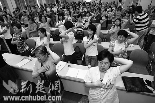 “乳房疾病很煩惱,自我檢查很重要,先舉手,后叉腰,對著鏡子仔細(xì)瞧……”昨天,一群女性在同濟(jì)醫(yī)院醫(yī)生帶領(lǐng)下,吟誦《乳房自查口訣》,做瑜伽操。