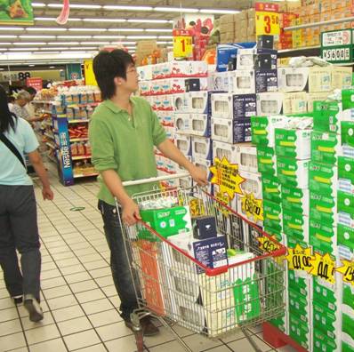 隨著京城確診兩例甲型H1N1流感,在馬連道的家樂福超市,記者看到牛奶產(chǎn)品區(qū)出現(xiàn)了購買熱潮。不少消費者的購物車中,都放著一兩箱牛奶,而促銷人員除了要忙著導購,還要不斷進行補貨。