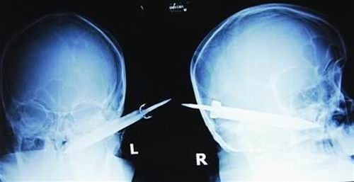 經(jīng)過檢查,醫(yī)生說這把長有10厘米左右的刀,從右耳窩上前方直接刺進(jìn)了鼻腔,離頜內(nèi)大動脈很近,刀卡在了骨頭中,要取出這把刀最怕大出血,萬幸的是這把三棱刀并沒有傷及大腦。