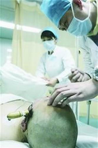 昨晚7時(shí)40分,剛被推出CT檢查室的文文,已被剃光了頭,頭上的黃色木刀把在燈光下反光。嘴巴、鼻子周圍的血已經(jīng)凝固。