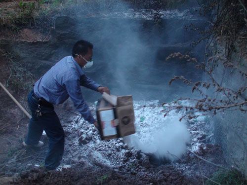 仙海區(qū)區(qū)狂犬病指揮中心得到消息后引起高度重視,迅速聯(lián)系區(qū)畜牧獸醫(yī)站和區(qū)疾病預(yù)防控制中心的有關(guān)技術(shù)人員趕往現(xiàn)場。全區(qū)同時啟動應(yīng)急預(yù)案,派出干警、治安聯(lián)防人員組成打狗隊前往協(xié)助,經(jīng)對被咬傷的牛和家犬現(xiàn)象觀察認(rèn)定,不明來歷的犬只極可能是瘋狗(狂犬),于是立即將被咬傷的人員送往區(qū)人民醫(yī)院進(jìn)行消毒和疫苗注射。在打狗應(yīng)急分隊的統(tǒng)一部署下,組織百余名群眾捕殺被咬傷的耕牛和狂犬及臨近家犬。