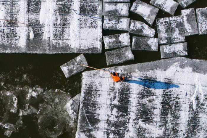 松花江哈爾濱段全面封凍 采冰工作井然有序