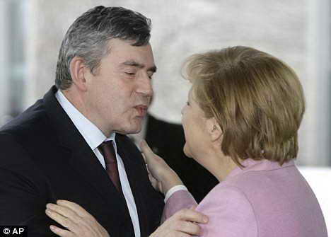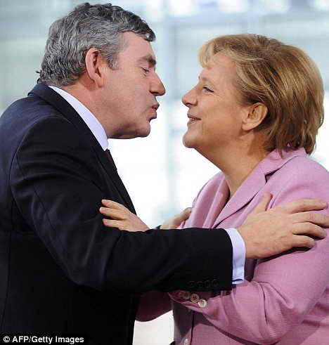 據(jù)英國《每日郵報》報道,英國首相布朗在親吻德國女總理默克爾的面部時顯得笨手笨腳,動作僵硬,他竟然誤撞在默克爾的鼻子上。