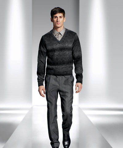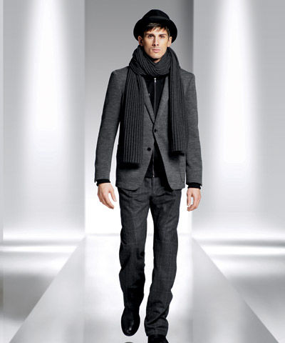 服裝的整體線(xiàn)條幾乎全都著墨于窄版、短身、合腰。而暗面布料如法蘭絨、羔羊毛、英國(guó)雪特蘭短羊毛、軋別丁斜紋防水布及粗氈羊毛,與亮面科技材質(zhì)如尼龍、絲、緞相互搭配,展現(xiàn)出強(qiáng)烈的視覺(jué)對(duì)比,富有華麗的時(shí)尚輪廓。色彩運(yùn)用最受男士們歡迎的黑、灰、深藍(lán)、橄欖綠及咖啡色為基調(diào),點(diǎn)綴以亮紅、軍綠色,再度以反差色系突顯搶眼的風(fēng)格;而金屬材質(zhì)適時(shí)加入,更具畫(huà)龍點(diǎn)睛的效果。