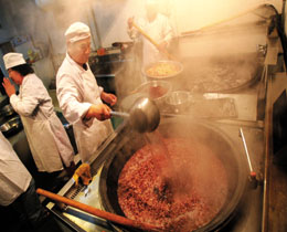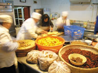 昨晚7時,記者來到廣化寺時,廚房里十多位義工已經(jīng)忙得不可開交。據(jù)一位義工介紹,兩天前他們就開始為熬臘八粥做準備,挑米、挑豆子,清洗原材料,一直忙到昨天下午,才將上千斤原料拾掇干凈。
