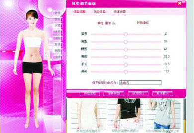 “網(wǎng)上試衣間”類似于網(wǎng)絡(luò)上曾經(jīng)流行的 “美女換裝游戲”,只是由專業(yè)公司開發(fā)的 “網(wǎng)上試衣間”,它可以根據(jù)網(wǎng)民自己上傳照片、填寫三圍,而設(shè)計(jì)出一個(gè)虛擬的“我”,在試衣間里試各種各樣的衣服。在一個(gè)試衣網(wǎng),網(wǎng)友可以點(diǎn)擊相關(guān)設(shè)置中的模特、頭像、體型、背景等,更換自己喜歡的模特、頭像和不同顏色、風(fēng)格各異的試衣背景,體型選項(xiàng)中為顧客提供了三圍、肩寬、身高、臂長(zhǎng)等參數(shù),顧客可以調(diào)整這些數(shù)據(jù)使模特的體型接近自己,制造完自己的模特后便可以在服裝欄中鏈接的網(wǎng)店去隨意挑選自己滿意的服裝了。