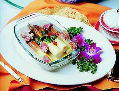 (5)春筍:被譽(yù)為“素食第一品”的春筍作為美味佳肴,自古以來備受人們喜愛。文人墨客和美食家對它贊嘆不已,有“嘗鮮無不道春筍”之說。春筍筍體肥厚,美味爽口,營養(yǎng)豐富,可葷可素。做法不同,風(fēng)味也各異,炒、燉、煮、煨皆成佳肴。地方名菜春筍均占一席之地,如上海的“枸杞春筍”,南京的“春筍白拌雞”,浙江的“南肉春筍”。不過,北方很難吃到新鮮的春筍,如果是弗爾瑪林里泡過的就算了吧。