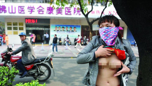 7日上午,趙女士站在廣東省佛山市康美醫(yī)院前的綠化帶中,身披條幅,敲擊銅鈸,一度撩起上衣,露出變形的雙乳,引來(lái)大批人群。趙女士稱(chēng)3個(gè)多月前于康美醫(yī)院隆乳,術(shù)后雙乳變形,欲索賠8萬(wàn)余元?得泪t(yī)院則稱(chēng)手術(shù)不理想是她個(gè)人體質(zhì)所致。