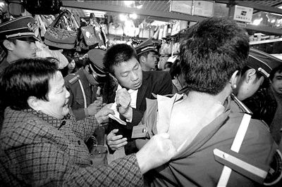 因售假受到封攤處罰,秀水街市場攤主與管理方的矛盾愈演愈烈。15日,秀水街市場對第三批8個被控售假的商戶進行封攤處理。其間,封攤?cè)藛T遇到了攤主及其“親友團”的殊死抵抗;一老太太還在地上打滾,堅決不讓保安靠近自己兒子的攤位。