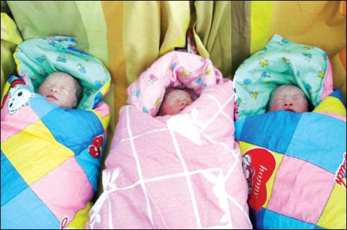 由于家里經(jīng)濟困難,這次直到懷孕5個月時,童芳才在丈夫的陪同下到醫(yī)院做B超檢查,發(fā)現(xiàn)懷的竟是三胞胎!爱敃r我又開心又擔(dān)心,開心的是竟然一次懷了三個,擔(dān)心的是怕三個全是女兒。”童芳坦言。