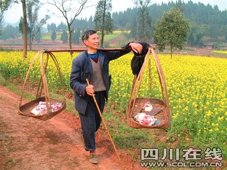 “割肉喲——”上午11點(diǎn)鐘,菜花叢中飛出抑揚(yáng)頓挫的聲音。循聲追去,見一盲人挑著肉擔(dān),拿著竹竿在鄉(xiāng)間小道上邊摸索前行,邊高聲吆喝!八褪菞钪心!”村民說(shuō)。