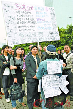 漫畫家名為黃達(dá)沖,在天河體育中心南門廣場舉著一面與他身高差不多的鐵牌,上面展示了他的“三國英雄前傳”漫畫以及他的宣言:“盲流行動(dòng)·賣稿賣身一千萬……”他一身牛仔套裝上前身后背也貼著多張漫畫作品,引得路人圍觀。何謂“盲流”?他解釋道,他是南寧人,來廣州十年,做過出版和媒體工作,現(xiàn)在快40歲了,還沒找到方向,所以認(rèn)為自己是盲流!拔胰ツ11月開始創(chuàng)作‘三國英雄前傳’,現(xiàn)在完成了一半,今天來到這里想找人投資。如果有誠意的話,私下談價(jià)錢……一千萬嘛,不一定是人民幣!痹谂赃呥有一位長發(fā)壯漢,是黃達(dá)沖的“哥們”,也是一位“自由藝術(shù)家”,正幫著他派傳單。