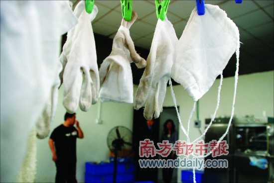“要客戶收貨,就一定要讓所有的餐具上不能有一點油漬和殘渣,所以餐具打包裝之前,一定要用手套或毛巾擦干凈!崩习迥飳τ浾哒f。然而,用于擦拭餐具的手套、毛巾都是隨處擺放,有的掛在電風(fēng)扇上,有的甚至放在地上。大部分手套的指尖部位都已經(jīng)發(fā)黑,甚至磨破了。