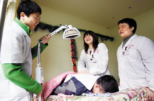 去年12月,劉瑞和周陽(yáng)回到重慶,開(kāi)始四處尋找合適的鋪面,“我們遇到很多好心人,知道我們是大學(xué)生,都是盲人,很多人主動(dòng)站出來(lái)幫我們!敝钢40多平方米的小診所,劉瑞說(shuō),房東王艷在從朋友口中知道了三人的遭遇后,主動(dòng)把自己的房子低價(jià)租給他們,并免去前三個(gè)月的房租,鼓勵(lì)三人創(chuàng)業(yè)。